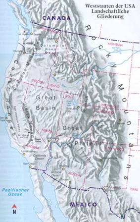 Geographie Die ungleichgewichtige Besiedelung, obwohl in der heutigen Entwicklung stärker durch andere, vornehmlich wirtschaftliche Faktoren beeinflusst, war zunächst die Folge der geographischen und klimatischen Gegebenheiten: Jedermann kennt die Rocky Mountains. Die Bezeichnung bezieht sich auf die östliche Ausbuchtung der Kordillerenkette, die sich durch ganz Nord- und Südamerika von Alaska bis hinunter nach Feuerland zieht. Man darf sich die Rocky Mountains nicht als ein durchgehendes Gebirge vorstellen; sie bestehen in Wirklichkeit aus einer ganzen Reihe von — oft nicht einmal direkt miteinander verbundenen — Teilformationen. Dazwischen befinden sich so genannte intermontane Hochebenen, durchweg trockene, sommerheiße Gebiete, die wegen ihres geringen landwirtschaftlichen Wertes großenteils menschenleer blieben. Typische Beispiele dafür sind das zentrale Wyoming, das Big Basin Nevadas und das Great Plateau, das im südlichen Utah, nördlichen Arizona und New Mexico angesiedelt ist und vom Colorado River durchschnitten wird. Das Große Plateau erinnert in der Realität nur selten an eine Ebene im Wortsinn. Es handelt sich um ein zusammenhängendes Gebiet auf vornehmlich 1.500 m-2.000 m Höhe, das unterschiedlichste Teilareale aufweist. Je nach klimatischen und topologischen Bedingungen findet man dort vegetationsarme Halbwüsten fast ohne Baum und Strauch, kahle Felslandschaften und dicht bewaldete Bergregionen. Die Mehrheit der Spitzen-Nationalparks (Grand Canyon, Zion, Bryce, Arches, Mesa Verde, Grand Staircase Escalante, das Freizeitdorado Lake Powell und das Monument Valley, aber auch die, größten Indianerreservate (Navajo und Hopi) liegen im Bereich dieser Hochebene.